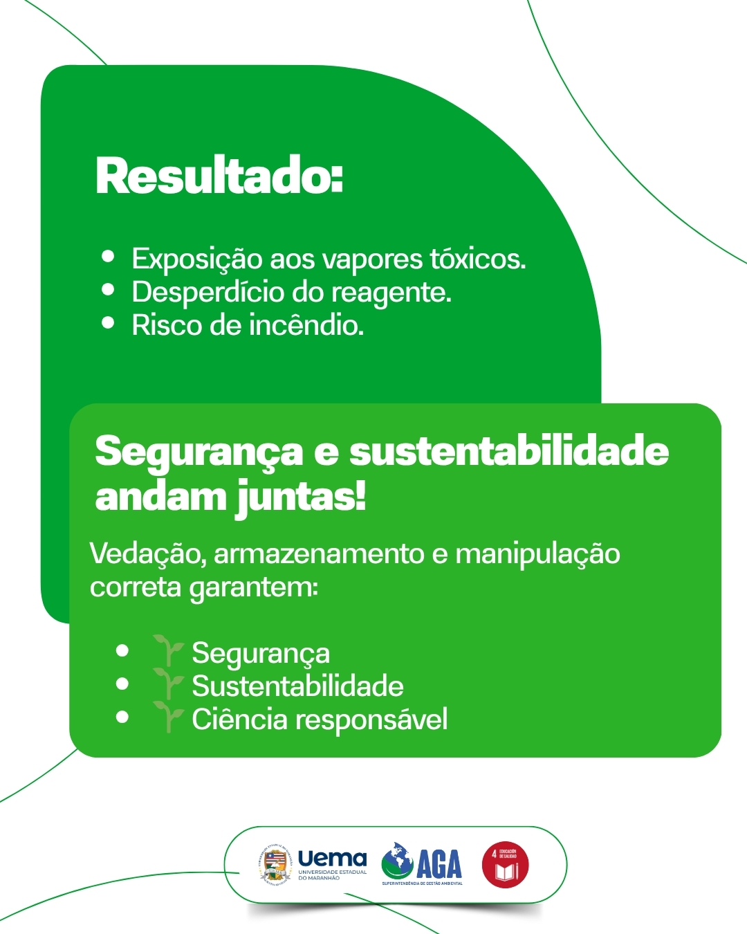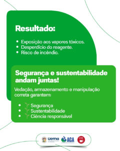 💬Segurança e sustentabilidade andam juntas: Cuidar da vedação, armazenamento e manipulação correta de substâncias voláteis garante a segurança, sustentabilidade e a realização de uma ciência responsável.