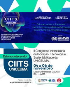 A Superintendência de Gestão Ambiental (AGA/UEMA), representada pela Profa. Dra. Andréa Araújo do Carmo, marca presença no II Congresso Internacional de Inovação, Tecnologia e Sustentabilidade (CIITS), realizado pelo Centro Universitário do Maranhão – UNICEUMA, entre os dias 04 e 06 de novembro, em São Luís/MA.