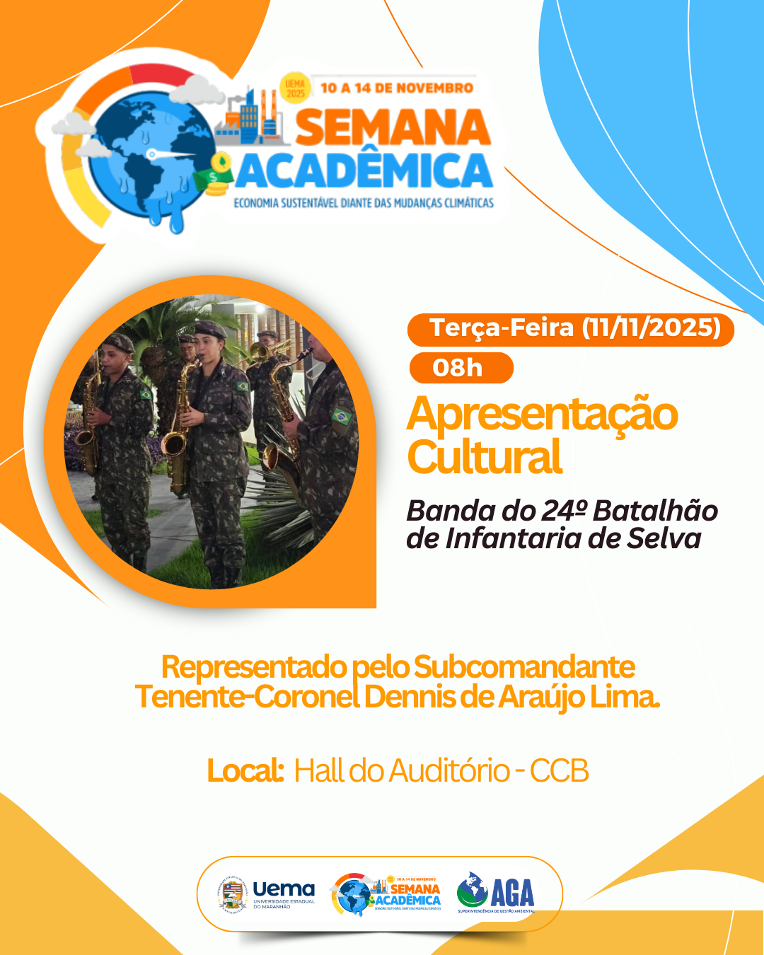 Dando início à Programação Ambiental da Semana Acadêmica da UEMA, no dia 11 de novembro teremos uma abertura especial com a Banda do 24° Batalhão de Infantaria de Selva, sob a regência do Tenente-Coronel Dennis de Araújo Lima.