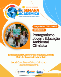 #ProgramaçãoAmbientalUEMA #AGA #UEMA #COP30 #EducaçãoAmbiental #JuventudePeloClima #Sustentabilidade #UEMAPeloMundo #SemanaAcadêmicaUEMA