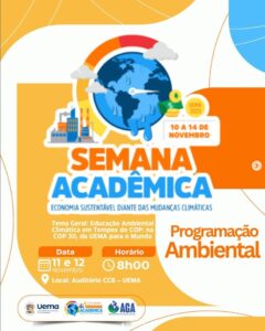 A Universidade Estadual do Maranhão convida toda a comunidade acadêmica, pesquisadores, estudantes e parceiros institucionais para participar da Semana Acadêmica 2025, que este ano traz como foco central a reflexão sobre os desafios da educação ambiental e climática diante das mudanças globais e da realização da COP 30, que acontecerá no Brasil em 2025.