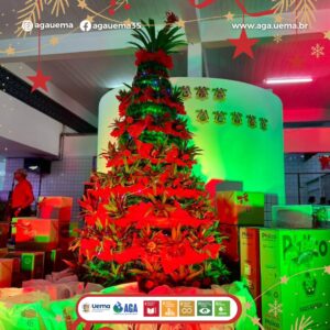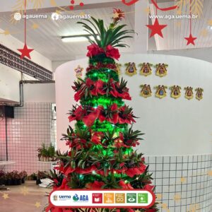 Com o tema “Árvore Viva – Natal Sustentável com Vida e Cor”, a estrutura de 2,5m foi montada com plantas como abacaxis ornamentais e bromélia, reforçando o cuidado com a natureza e os ODS da Agenda 2030.