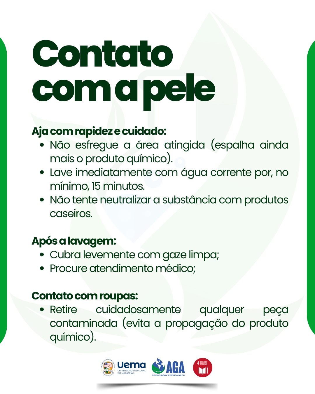 Não esfregue, pois isso espalhar ainda mais o produto químico, Lave a área atingida com água corrente por, no mínimo, 15 minutos, Não tente neutralizar a substância com produtos caseiros. Após a lavagem, cubra levemente com gaze limpa e procure atendimento médico.