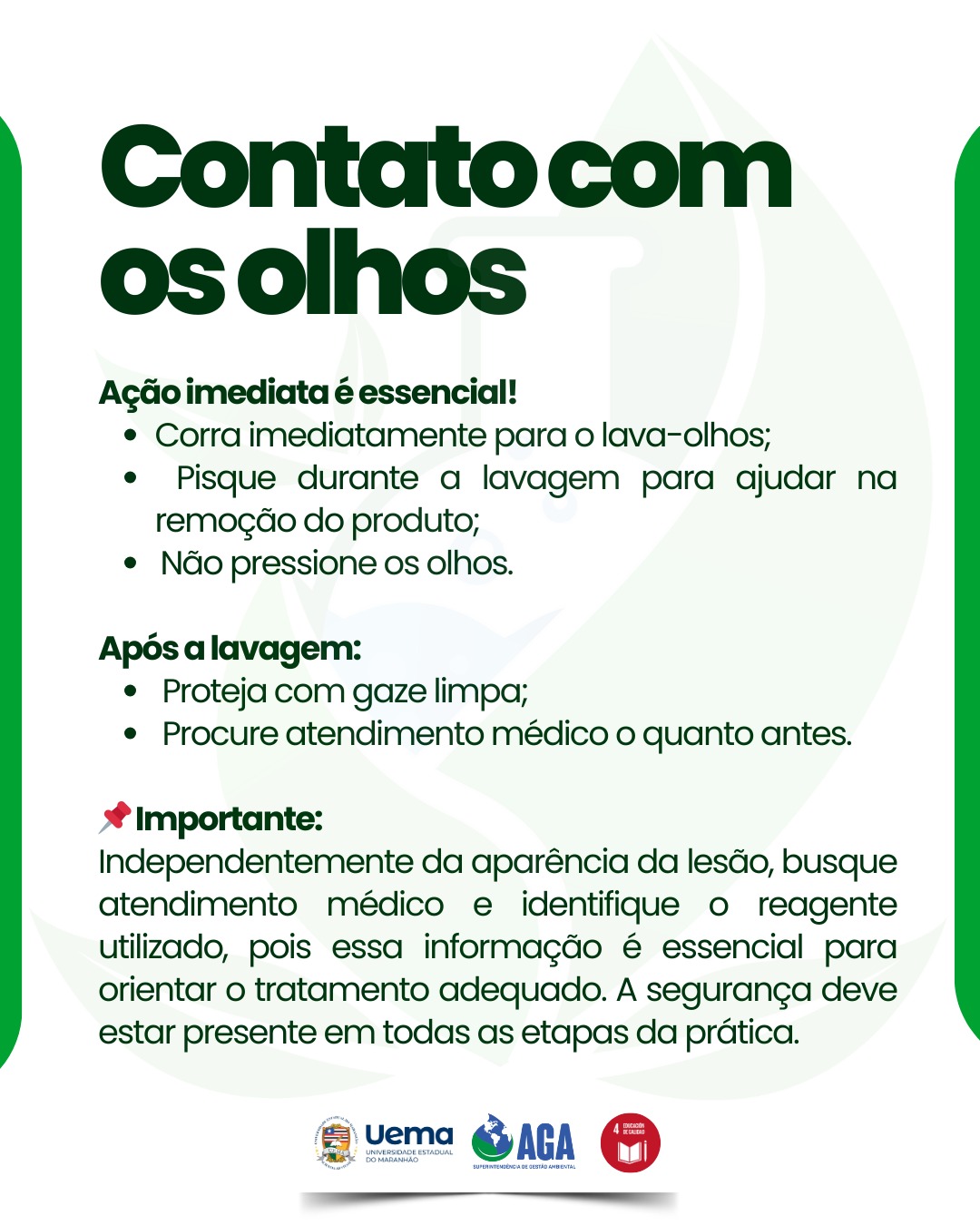 Corra imediatamente para o lava olhos Pisque durante a lavagem para ajudar na remoção do produto, não pressione os olhos. Proteja com gaze limpa e procure atendimento médico o quanto antes.