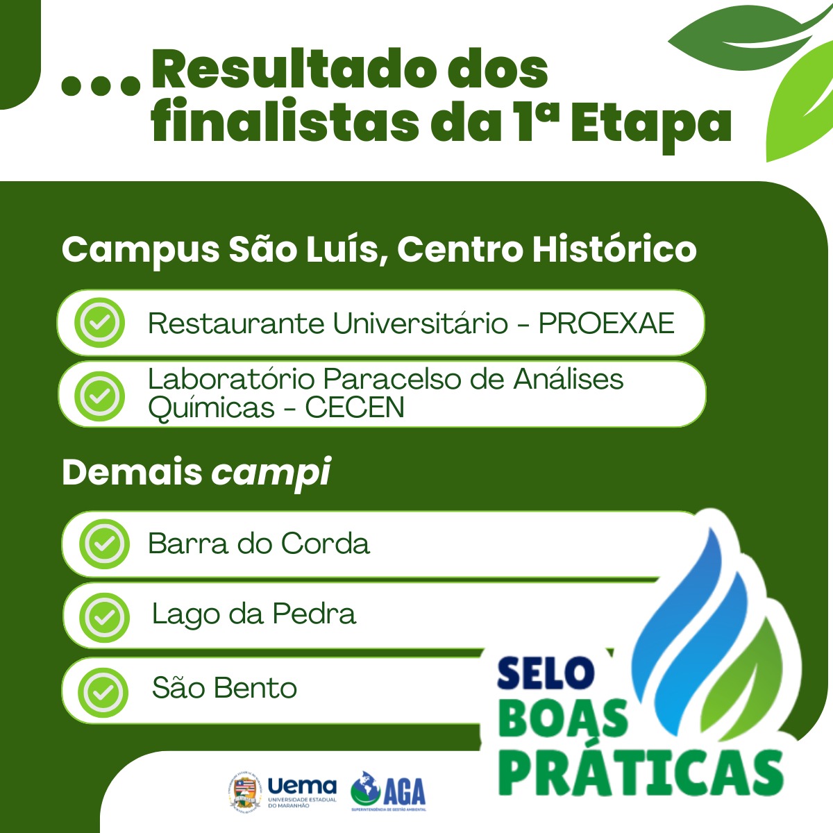A Superintendência de Gestão Ambiental (AGA/UEMA) torna público o resultado da primeira etapa do Selo Boas Práticas, iniciativa que reconhece e valoriza ações sustentáveis desenvolvidas nos campi da Universidade Estadual do Maranhão.