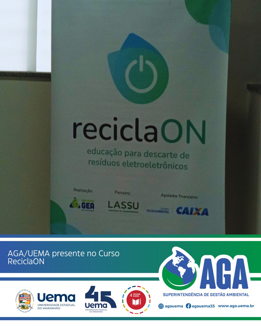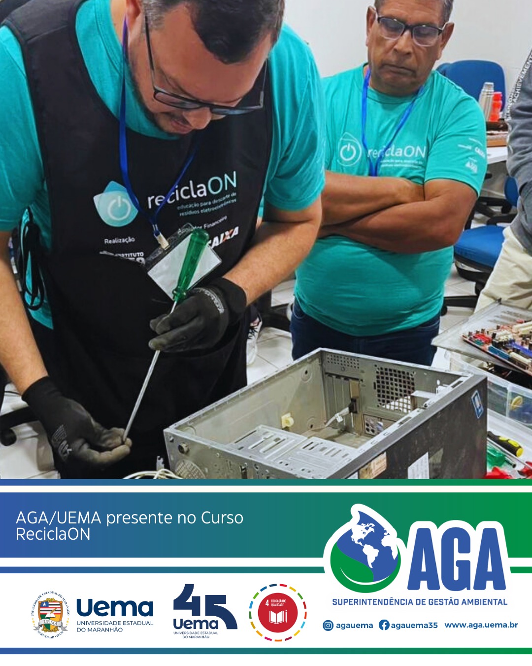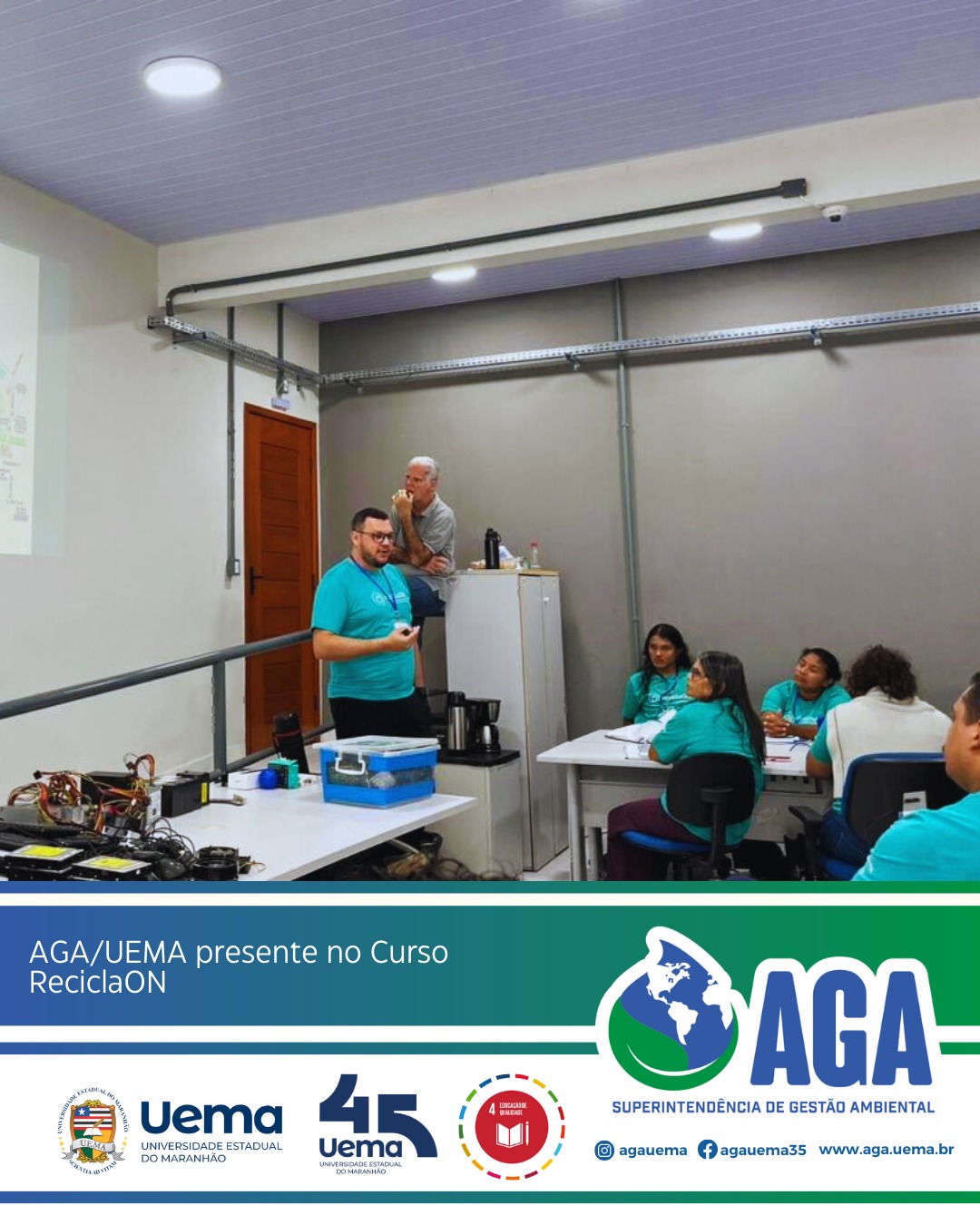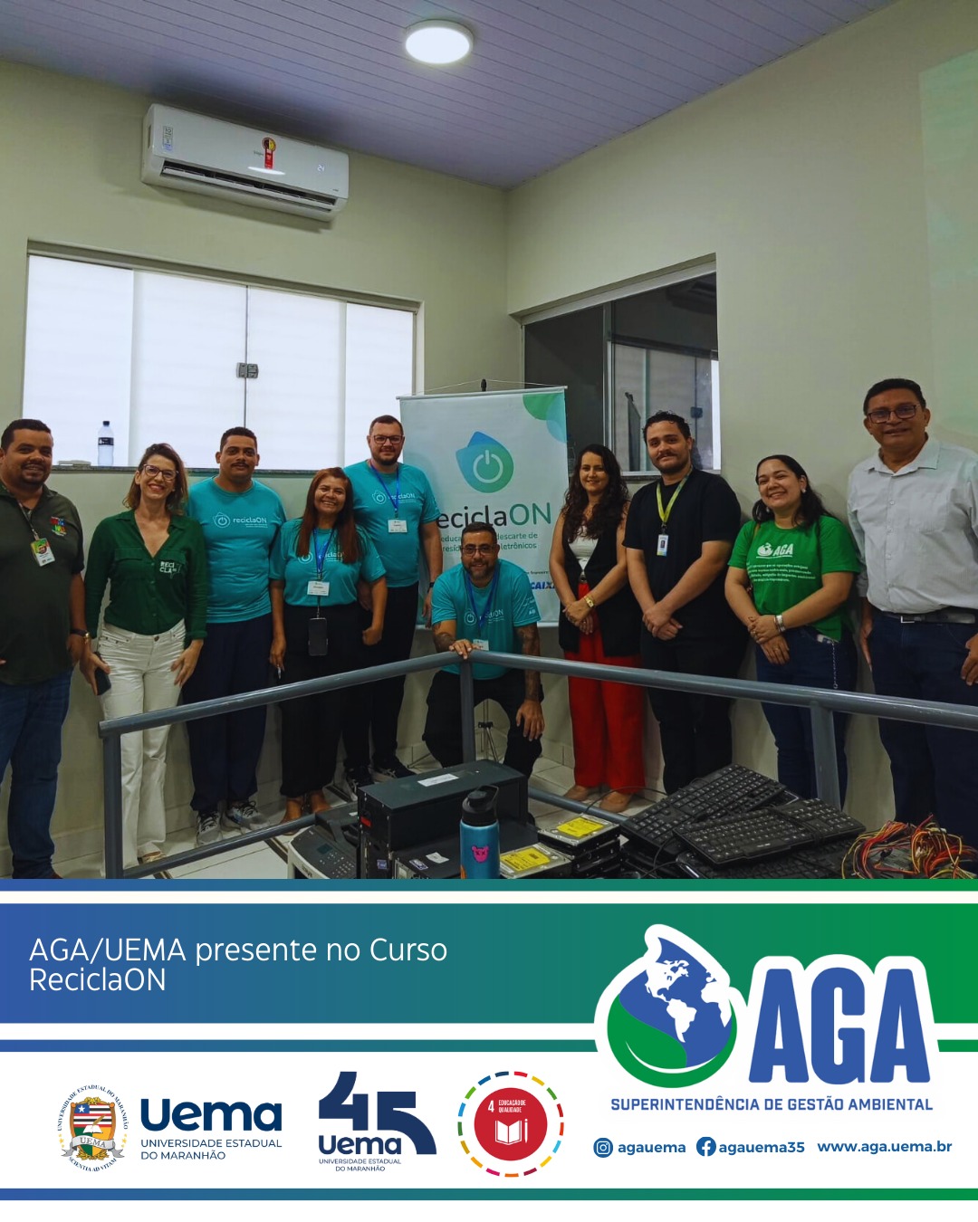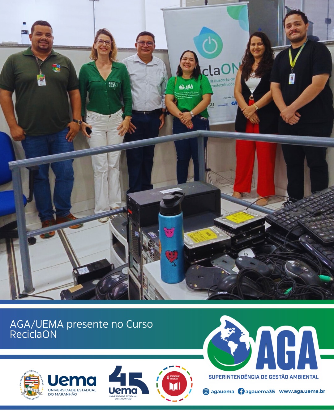 A Superintendência de Gestão Ambiental (AGA/UEMA) esteve presente no dia 11 de março no Curso de Educação para a Destinação Socioambiental de Resíduos Eletroeletrônicos – ReciclaON, realizado na UEMA.